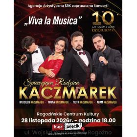 bilety: "Viva La Musica" to zupełnie nowy koncert jedynej w Polsce rodziny śpiewającej muzykę klasyczną. W wykonaniu Śpiewającej Rodziny Kaczmarek usłyszycie państwo tym razem najpiękniejsze melodie z operetki min. Wesołej wdówki, Hrabiny Marizy, Księżniczki Czardasza, czy Guditty, przeboje z musicali min: Skrzypka na dachu, My fair lady czy Upiora w operze, a także piękne standardy muzyki rozrywkowej, piosenki z repertuaru Franka Sinatry Elvisa Presleya, Poula Anki czy Luisa Armstronga. Śpiewająca Rodzina Kaczmarków artyści: Iwona Kaczmarek, Piotr Kaczmarek, Wojciech Kaczmarek, Adam KaczmarekŚpiewająca Rodzina Kaczmarków - dobrze znana w całej Polsce. Koncertują razem od 4 lat. Adam i Wojtek dali się poznać szerokiej publiczności po występie w programie Mam talent, odnosząc tamże ogromny sukces. Adam Karczmarek to również gość Festiwalu Piosenki Krajowej w Opolu. Bilety do nabycia na: KupBilecik.pl |