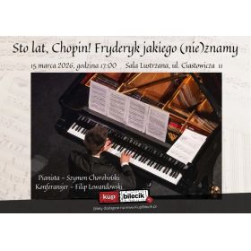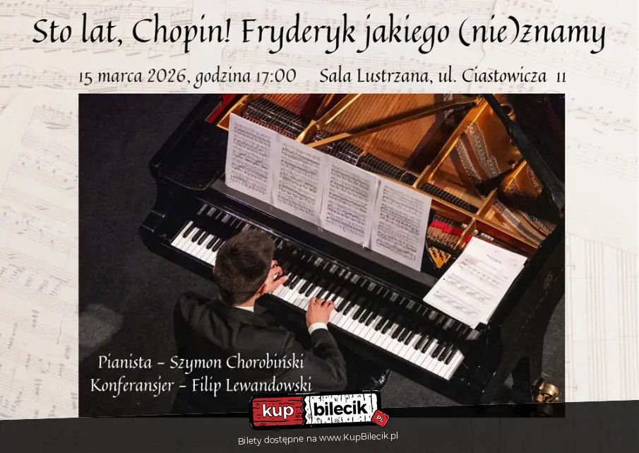 bilety: Przy fortepianie zasiądzie Szymon Chorobiński - pianista-akompaniator, a słowem poprowadzi nas przez mniej znane historie z życia kompozytora Filip Lewandowski. To będzie spotkanie z Chopinem bliskim, prawdziwym, może nawet zaskakującym. Bilety do nabycia na: KupBilecik.plSzymon Chorobiński artyści: Szymon ChorobińskiPianista-akompaniator, a słowem poprowadzi nas przez mniej znane historie z życia kompozytora Filip Lewandowski. Bilety do nabycia na: KupBilecik.pl |